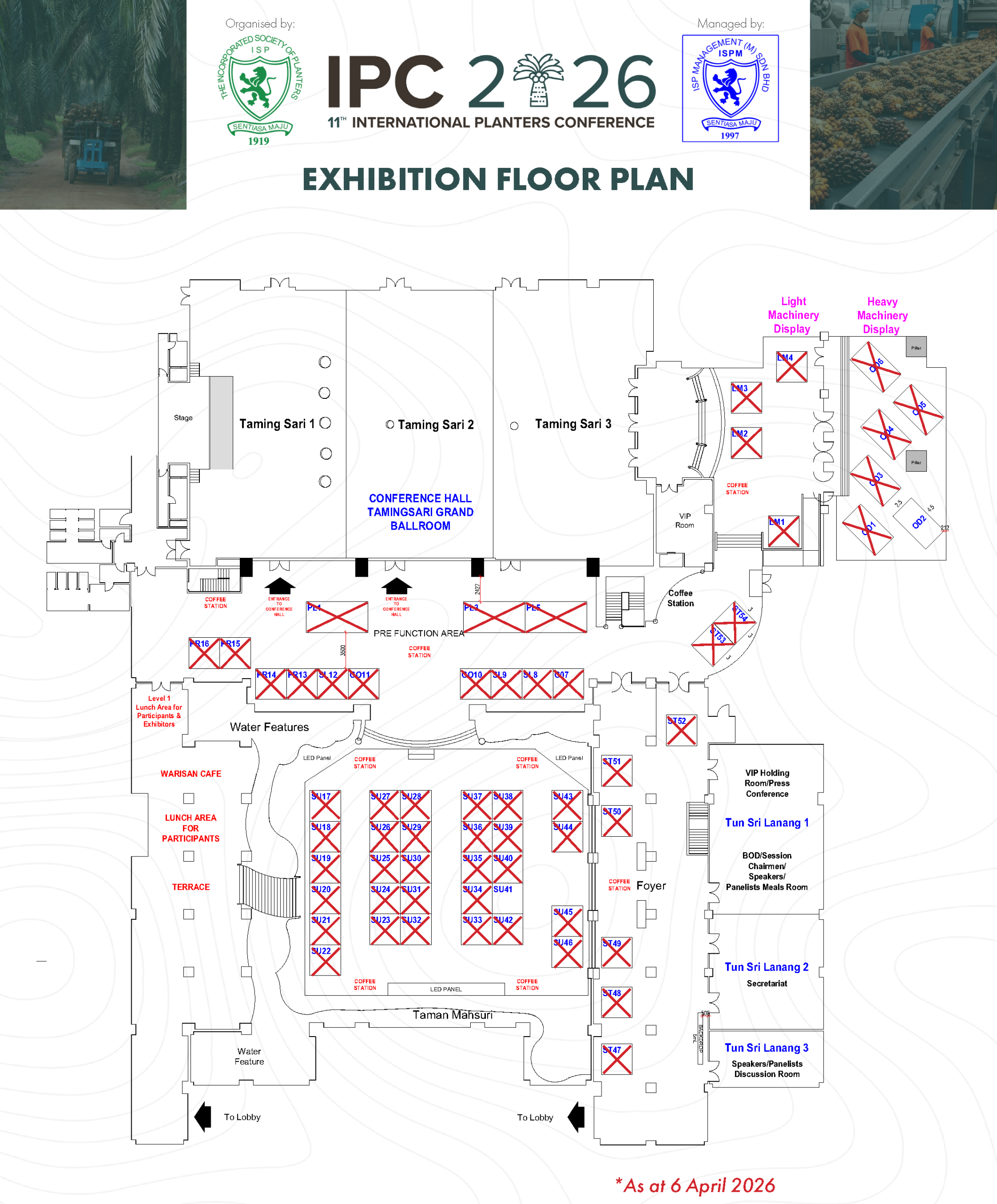 An exhibition featuring agro-chemicals, fertiliser, planting materials, service providers, farm machineries and mechanisation technologies related to the oil palm industry will be held. The exhibits will be displayed on Monday and Tuesday, 13 & 14 July 2026. Exhibition booths are available for booking.